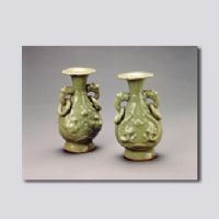 首都博物館藏。喇叭口,長(zhǎng)頸,溜肩,垂腹,圈足。頸肩和腹部飾有弦紋,頸部?jī)蓚?cè)各有一獸耳銜環(huán)。腹部凸雕雙龍及雙鳳紋。釉色淡青,釉層厚潤(rùn)。器物造型淳樸,胎體厚重。龍泉窯始燒于北宋前期,南宋極盛,明中后期漸衰。