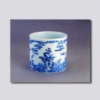 首都博物館藏。直口,口底直徑相若,平底,底部有玉壁形澀圈。外壁通景繪以壽石、蝙蝠、海浪、祥云,組成壽山福海的吉祥圖案,寓意“福如東海,壽比南山”。釉面瑩潤,白中泛青,胎體堅(jiān)硬,潔白細(xì)膩。青花繪畫是追摹明朝永樂、宣德時(shí)期青花的特色,線條間用筆點(diǎn)染出蘇泥勃青料的暈散效果與結(jié)晶斑點(diǎn)。畫面布局舒朗,筆觸纖細(xì),十分典雅。
