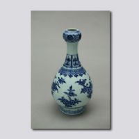 首都博物館藏。蒜頭口,細(xì)長(zhǎng)頸,圓腹,圈足?谘叵吕L一周回紋和纏枝蓮紋。頸下部與肩部,繪變形蓮瓣紋、回紋和如意云頭紋。腹部主題紋飾為石榴、枇杷、牡丹、菊花等折枝花果紋。底書青花“大清乾隆年制”6字3行篆款。圖案布局疏朗,錯(cuò)落有致,青花色澤靛藍(lán)濃深,制作精細(xì)。因器口形制似蒜頭,故有“蒜頭瓶”之稱。