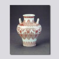 首都博物館藏。扁圓形。撇口,短頸,豐肩,繩耳,斂腹,圈足。周身用釉里紅繪畫紋飾,口沿下飾回紋一周,肩及下腹部為變形蕉葉紋,腹部繪朵蓮紋。底足內(nèi)書“大清乾隆年制”6字3行篆書款。白釉泛青,釉里紅色調(diào)艷麗。
