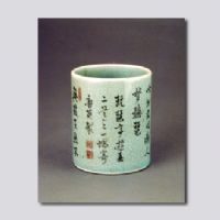 首都博物館藏。圓口,直壁,平底,內(nèi)外施天藍(lán)色釉,有細(xì)開片。上書《琵琶亭游春》詩:“興致天然不減加,那關(guān)名勝與鶯花。香山偶爾逢商婦,博望何須定漢槎。事業(yè)昔賢難尚友,風(fēng)騷老我自成家。會心得意謳吟外,且作癡人夢聽琶。”款為“蝸寄唐英制”。有“古柏堂”、“蝸寄”和“居士”3方篆文章。唐英,字俊公,在雍正六年至乾隆二十一年曾任景德鎮(zhèn)御窯廠督陶官,期間制作了一些唐英署款的瓷器。這件筆筒是唐英親自制作的。