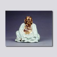 首都博物館藏。此尊方頭大耳,笑容可掬。身披通肩袈裟,袒胸鼓腹,頭和胸腹處均涂飾金漆,袈裟上施仿哥釉,滿布開片,自然形成田子格,宛如自然的“田相”。