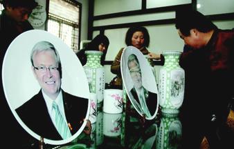 昨天上午十時,印有澳大利亞總理陸克文頭像的直徑40厘米掛盤以及5個山水四方瓶和5套梅花六頭文具在醴陵市瓷藝堂成功出窯。這批瓷器將在國家政治局常委李長春出訪澳大利亞時當(dāng)做國禮送給澳總理陸克文以及其他官員。