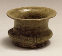 說 明: 器物敞口,沿外卷,細(xì)長(zhǎng)直徑,扁圓腹,圈足。