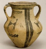 說 明:  泥質(zhì)土黃陶。小口外侈,長徑、溜肩、折腹、平底。