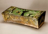 說 明: 枕形作銀錠式。遍施黃、綠、白三色釉。