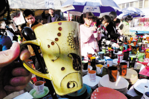 北京西城區(qū)一家小商品批發(fā)市場,經(jīng)營陶瓷商店近十年的張先生熱情地向客戶介紹:“這一批日用瓷器本來是要出口的,但因?yàn)榻鹑谖C(jī),廠商的海外訂單都給取消了,我剛從廠里面那兒拉過來。這一套杯碟我就賣個25元,但廠商跟我介紹說,貼上國外的牌子就是上百元呢。”