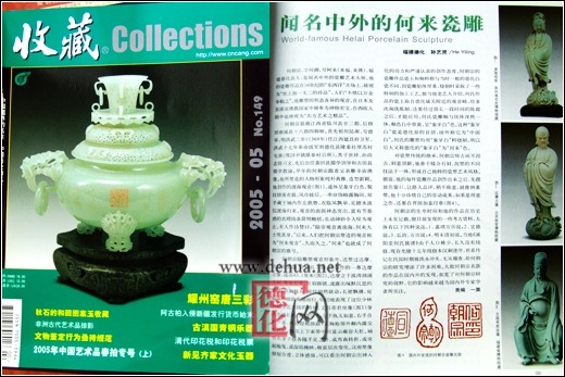 何朝宗除雕塑觀音形象外,還塑過達(dá)摩、菩提等佛像,皆別具一格。他創(chuàng)作的一尊達(dá)摩立像,通高43.1厘米。達(dá)摩立于波濤洶涌之間,禿頭長耳,雙屑微鎖,流露出緘默沉思的表情;袒胸披肩,帔紋翩然欲動;長裙飄拂,宛如乘風(fēng)破浪疾馳而行,恰切地表現(xiàn)了這位少林初祖堅(jiān)忍不拔的精神。文昌帝君坐像身著寬袖長袍,正襟危坐;左手執(zhí)玉如意,右手自然下垂,兩足蹬靴微露;上胸袍領(lǐng)外翻內(nèi)露交角襯衫;腹部上下束帶中間顯示雍容大肚。袖臂衣身下擺各隨手足之勢,或彎曲轉(zhuǎn)折,成突起拖拽,或深陷掩映,極富層次變化。這座塑像修短合度,立體感強(qiáng),可以看出何朝宗出神入化的功力和嚴(yán)謹(jǐn)認(rèn)真的創(chuàng)作態(tài)度。何朝宗的瓷雕作品瓷土和釉料都與當(dāng)時(shí)一般的德化白瓷不同,因瓷雕胎體厚重,燒制時(shí)采取了一些特別的加工工藝。據(jù)當(dāng)?shù)乩纤嚾私榻B,何氏作品的瓷土取自德化城關(guān)附近的觀音崎,經(jīng)多次淘洗煉制,還要經(jīng)過很長一段時(shí)間的陳腐之后,才能應(yīng)用。何氏瓷雕釉與坯體渾然一體,釉色白中帶黃,呈“象牙白”色。這種“象牙白”瓷是德化窯的首創(chuàng),國外稱它為“中國白”。何氏的雕塑均用“象牙白”料燒制,所以后人又稱德化的“象牙白”為“何來”色。