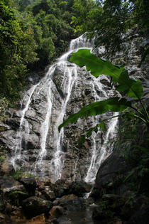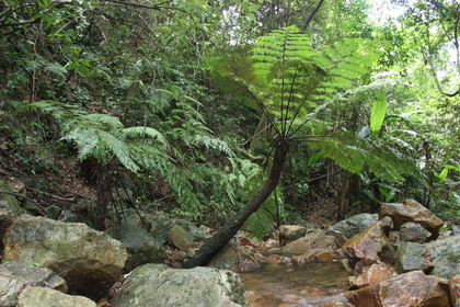 在水府山谷不到1平方公里的范圍內(nèi)發(fā)現(xiàn)的桫欏有上百棵,最高的達(dá)7米,最大直徑43厘米,蕨葉最長3.1米。在神谷山水的滋養(yǎng)下,依然保持著古樸與悠遠(yuǎn)。谷中處處潭、瀑、洞、泉,千年古藤繞樹盤石,“活化石”刺桫欏生機(jī)勃勃,無不透著古樸神秘的原始?xì)庀ⅰ?/p>
