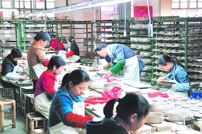 在國(guó)際金融危機(jī)影響下,德化縣三班鎮(zhèn)陶瓷產(chǎn)業(yè)依靠穩(wěn)住生產(chǎn)、產(chǎn)業(yè)升級(jí)、延伸產(chǎn)業(yè)鏈,進(jìn)一步壯大實(shí)力。近兩個(gè)月來(lái),宏順陶瓷有限公司接到30萬(wàn)美元訂單,目前已吸納其他陶瓷產(chǎn)區(qū)180多名熟練技術(shù)工人。圖為宏順生產(chǎn)車間一角。 劉益清 陳尹荔 黃鵬輝 攝
