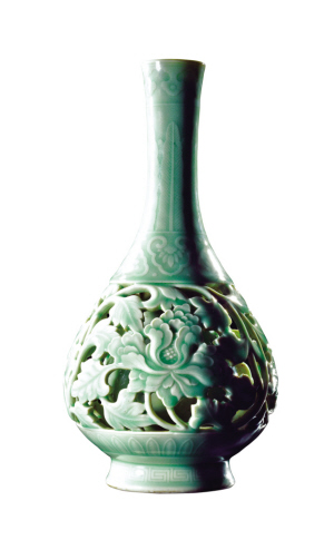 香港蘇富比昨日舉行的“玲瓏八寶──歐洲私人清宮御瓷收藏專場”,八件拍品全部賣出,其中賣得最好的是清乾隆粉青釉浮雕芭蕉葉紋鏤空“纏枝牡丹圖”長頸膽套瓶,事前估價1500萬至2000萬元,結果以4770萬元成交。該長頸膽套瓶由歐洲私人收藏家在上世紀六十年代收集,逾四十年來從未曝光。