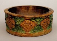 說(shuō) 明: 淡黃色陶胎,較堅(jiān)硬,上白色化妝土,內(nèi)施黃釉,紋飾講究對(duì)稱,作工精巧.