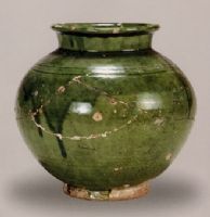 說 明: 胎質(zhì)較粗,紅褐色。胎壁內(nèi)外掛白色陶衣,表面施綠釉,施釉不均。