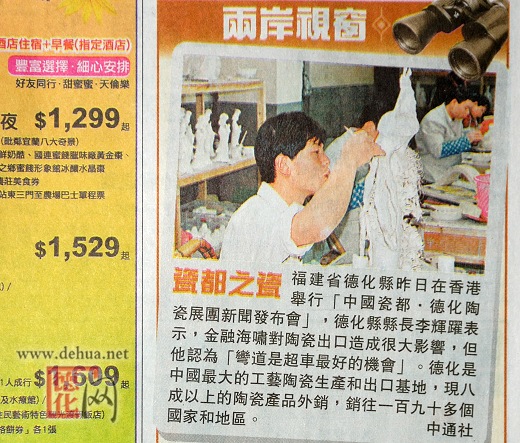 星島日報(bào)21日訊,福建省德化縣日前在香港舉行“中國瓷都·德化陶瓷展團(tuán)新聞發(fā)布會”,德化縣縣長李輝躍表示,金融海嘯對陶瓷出口造成很大影響,但他認(rèn)為“彎道是超車最好的機(jī)會”。