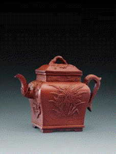 宜興紫砂明代萬歷年間已開始進(jìn)入宮廷供奉御用,這次"嘉德"的"紫泥菁英"專場(chǎng)匯集了35件清代至民國的紫砂壺以及10余件茶葉罐及文房具,其中幾件清初外銷的紫砂器非常惹眼。外銷的紫砂器多以朱泥制作為主,制作技藝往往加以貼花、鏤空、泥繪等工藝手法,其燒成技藝具有相當(dāng)大的難度。朱泥佳品還有其得天獨(dú)厚的"帶油性",光澤韻味尤為可人。此類紫砂作品常見于歐洲博物館,也是許多資深藏家追捧的對(duì)象。此次上拍的"清康熙 貼花朱泥方壺"即以上佳朱泥制成,壺身四面分別貼上水仙、靈芝竹紋、梅鶴、松樹松鼠等祥瑞圖案,此壺式常見于康雍年間紫砂大壺,如此小尺寸方壺較為罕見。此外,"清初鏤雕梅花朱泥梨形壺"等也是外銷紫砂器的佳作。