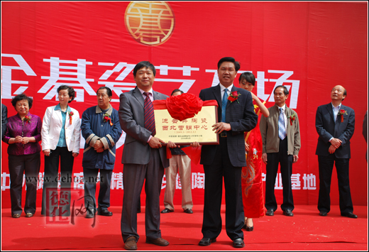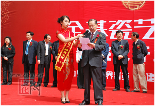 縣委常委、宣傳部長涂健圻為中國瓷都·德化迪云舟陶瓷西北營銷中心授牌、縣政府副調(diào)研員黃發(fā)建代表陶瓷產(chǎn)區(qū)講話并向金碁瓷藝廣場贈送禮品,中國陶瓷工業(yè)協(xié)會、陜西省、西安市等領(lǐng)導(dǎo)出席授牌儀式。