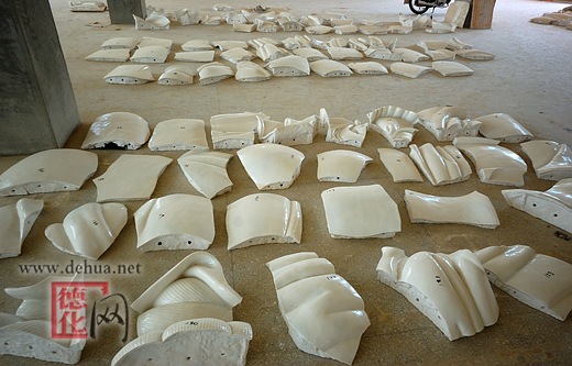 模具成型后,又將其無(wú)規(guī)則地分解成138塊,其中身體137塊,頭部、臉部組成1塊,然后從頭到腳對(duì)每一塊進(jìn)行統(tǒng)一編號(hào)。接著創(chuàng)作人員參照模具雕制出每一塊坯體,坯體的厚度均在3厘米--5厘米以上,最厚的達(dá)20厘米以上,是平常燒制藝術(shù)瓷的100倍。頭部坯體高140厘米,寬110厘米,厚80厘米,重約250千克,需6個(gè)人同時(shí)出力才能翻動(dòng)它。