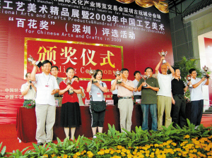 據(jù)組委會負(fù)責(zé)人介紹,本次共有1460件作品入圍,經(jīng)層層評選,連紫華的陶瓷作品《西方三圣》、陳明良的陶瓷作品《童子拜觀音》、于涇的玉雕作品《5·12》等72件作品獲金獎;顧啟望、呂志賢的翻簧竹刻作品《蘭閨雅集圖》等94件作品獲銀獎,另外,還評出銅獎89件,優(yōu)秀獎98件,創(chuàng)意獎19件,工藝獎19件。其中既有許多德藝雙馨的工美大師的精品大作,也有很多年富力強(qiáng)的中青年工美技師的代表力作,還有不少初出茅廬的工美新生代的處女作,基本上代表了我國工藝美術(shù)最高水平,體現(xiàn)出了當(dāng)今中國工藝美術(shù)行業(yè)產(chǎn)地和項(xiàng)目相對集中、種類多姿多彩、市場日趨成熟、創(chuàng)作隊(duì)伍不斷擴(kuò)大、優(yōu)秀作品層出不窮、百花齊放、爭芳斗艷的大好局面。不少作品的工藝精湛、手法嫻熟,很好地繼承和發(fā)揚(yáng)了各個工藝美術(shù)門類的傳統(tǒng)特色;還有一些創(chuàng)新之作取材新穎、構(gòu)思獨(dú)特,非常富有時代氣息。其中來自上海玉雕大師于涇先生的反映四川汶川大地震的作品《5·12》就是一件具有深刻影響力和強(qiáng)烈的震撼力的工美佳作。