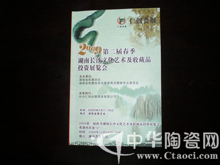 由湖南省收藏協(xié)會(huì)、湖南省收藏協(xié)會(huì)古典家具及雕塑專業(yè)委員會(huì)共同主辦的“2009第二屆湖南長沙文化藝術(shù)及收藏品投資展覽會(huì)”于2009年5月10日在湖南省展覽館圓滿閉幕。榮獲中國行業(yè)電子商務(wù)網(wǎng)站100強(qiáng)的中華陶瓷網(wǎng)成為本次展會(huì)合作媒體,進(jìn)一步宣傳了展會(huì)情況及中國文化的底蘊(yùn)。