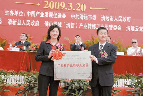3月20日,全國陶瓷產(chǎn)業(yè)轉(zhuǎn)移示范基地在廣東清遠(yuǎn)市清新縣奠基。冠星是首批入駐的企業(yè)。圖為廣東省省長黃華華向清遠(yuǎn)市市長徐萍華授牌。