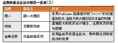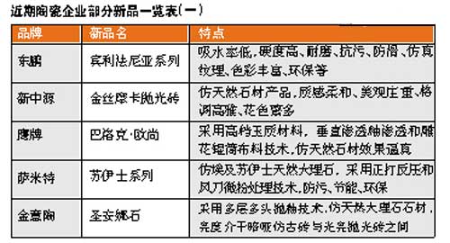 據(jù)本報(bào)記者走訪市場(chǎng)發(fā)現(xiàn),與去年相比,今年推出的新品中仿古磚數(shù)量減少,拋光磚和瓷片的新品數(shù)量增加。而且三個(gè)品類的產(chǎn)品不少都有模仿天然石材的特點(diǎn)。衛(wèi)浴產(chǎn)品傾向于在藝術(shù)造型及節(jié)水功能上作改變。