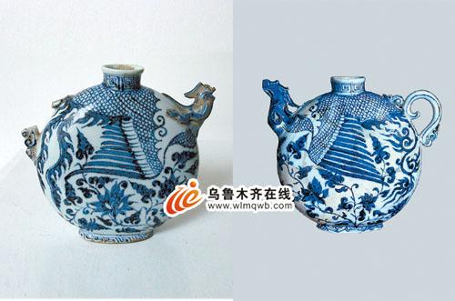 左圖為馬忠挖出的元代青花鳳首扁壺。右圖為北京出土的元代青花鳳首扁壺。