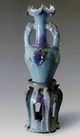 說 明: 造型別致,通體施天藍色釉,配上紫紅、藍、褐等艷麗的彩斑,更顯華貴。