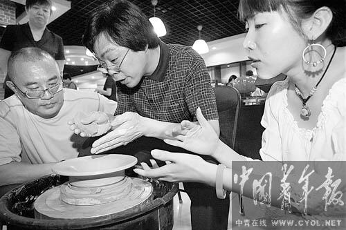 5月28日,北京合璧興陶瓷藝術(shù)館,陶藝大師徐定昌(中)與收藏愛好者交流制作青瓷的心得。當(dāng)天,來自浙江龍泉的中青年青瓷大師在這里進(jìn)行作品巡展,展覽將延續(xù)到6月30日,并向市民免費(fèi)開放。