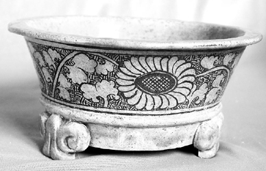 這尊孔雀藍(lán)香爐產(chǎn)自明代早期磁州窯。孔雀藍(lán)香爐為出土之物。高7厘米,直徑14厘米,爐內(nèi)外均施孔雀藍(lán)釉,厚唇,爐身朝外自然敞開,呈喇叭狀,爐身盛開三朵黑釉葵花,視覺效果突出,四周配上莖葉,主次分明,畫面剩余空白處采用席紋補(bǔ)白,筆意流暢,構(gòu)圖精巧。香爐圓底露胎,留有修胎的痕跡;爐腰下有凸起圈,圈下外裝飾三只浮雕型如意足,特色鮮明,十分大氣。