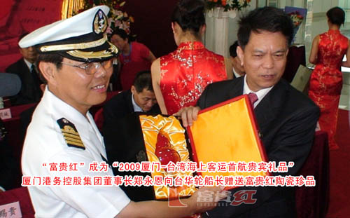 2009年4月8日,為構(gòu)建職業(yè)教育交流平臺(tái),促進(jìn)兩岸經(jīng)濟(jì)文化雙贏,由第十三屆臺(tái)交會(huì)組委會(huì)、福建省中華職業(yè)教育社、臺(tái)灣教育會(huì)、廈門市政協(xié)教科文委和廈門市教育局等主辦的2009海峽兩岸高等職業(yè)教育展覽會(huì)在廈門會(huì)展中心開幕,共有來自海峽兩岸的100余所高等職業(yè)院校參展。全國政協(xié)常委、港澳臺(tái)僑委員會(huì)副主任陳明義,福建省委常委、廈門市委書記何立峰,全國人大常委林強(qiáng)等領(lǐng)導(dǎo)出席了開幕儀式。富貴紅珍品《小金瓶》成為本次展覽會(huì)唯一指定禮品。2009年4月22日,廈門—臺(tái)灣海上客運(yùn)首航儀式在廈門市海峽郵輪中心舉行。福建省委常委、廈門市委書記何立峰,海峽兩岸航運(yùn)交流協(xié)會(huì)理事長胡漢湘,臺(tái)灣航業(yè)股份有限公司董事長張義源等出席了啟動(dòng)儀式。儀式結(jié)束后,有關(guān)領(lǐng)導(dǎo)和人士共同轉(zhuǎn)動(dòng)起航航舵,臺(tái)華輪正式起航,開啟了廈門對臺(tái)滾裝客運(yùn)的新篇章。富貴紅珍品《福祿連枝》、《觀月聽潮》成為本次活動(dòng)的貴賓禮品。