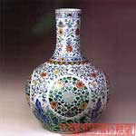 人們把斂口短頸,上闊下斂,腹大而扁,砂底微凹的瓷器,稱之為天球瓶。斗彩又名逗彩,是釉下青花與釉上彩繪相結(jié)合的一種裝飾藝術(shù)。明宣德時景德鎮(zhèn)始創(chuàng),成化時非常發(fā)達,清雍正時有進一步發(fā)展。斗彩先以釉下青花在坯上描繪勾勒,上釉燒成后再用釉上彩填涂或點涂成完整的花紋,使用的彩料主要含鐵、銅和鈷,成品色彩豐富、鮮明,繪畫內(nèi)容亦多種多樣。