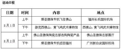“上帝”待遇的一站式采購,令所有團(tuán)購業(yè)主免費(fèi)雙飛、吃住星級酒店、游覽廣東四大名山之一:西樵山(世界上最大的觀音佛像所在地)以及世界名人黃飛鴻武術(shù)博物館,加上豪華大巴來回接送,可盡情領(lǐng)略佛山人文風(fēng)貌、商業(yè)精髓。就是要盡一切可能讓業(yè)主朋友們真正做“上帝”。考察匯聚精品的五星級圣德保陶瓷總部展廳,體驗(yàn)五星級服務(wù),選購心儀已久的瓷磚產(chǎn)品,享受全線產(chǎn)品廠價(jià)直銷。