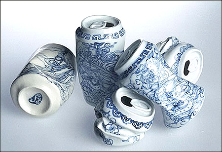 這幾個易拉罐是按照1:1設(shè)計(jì)制作,外觀采用了中國傳統(tǒng)的“青花”工藝,圖案也是中國的神話人物。設(shè)計(jì)師是Lei Xue,出生于中國青島。準(zhǔn)確的說,這是易拉罐造型的青花瓷藝術(shù)品,十分有意思。