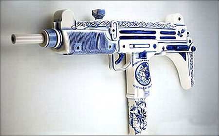 這支陶瓷槍有點(diǎn)像奧地利 MPi69 9mm沖鋒槍,MPi69 是1960年代的優(yōu)秀沖鋒槍之一。這支陶瓷槍整體均是陶瓷工藝,上面的圖案是手工畫上去的,感覺有點(diǎn)像中國的青花,由藝術(shù)家Charles Wing Krafft 設(shè)計(jì)制造。賣價:1800美元。
