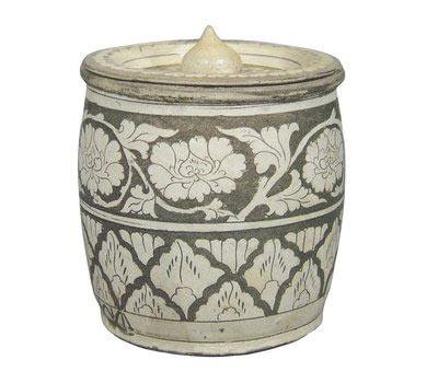 牡丹被人們視為富貴的象征。宋周敦頤《愛蓮說(shuō)》云:“牡丹,花之富貴者也。”所以,牡丹花又稱富貴花。西夏在經(jīng)瓶、扁壺、罐、盆、缽、盤和碗等器物上剔刻或模印大量牡丹花;y有折枝、纏枝和交枝三種。西夏陵出土的牡丹紋盤,盤內(nèi)模印三枝交枝牡丹,枝頭綴以怒放的花朵,花朵兩俯一仰,宛如牡丹池中盛開的牡丹花交織在一起。同時(shí)出土的牡丹紋碗,碗內(nèi)模印兩枝牡丹,一俯一仰,兩花相對(duì),婀娜俊俏。磁窯堡窯址出土的牡丹花紋瓷器多為剔刻技法,其中折枝牡丹在開光內(nèi),以一朵花為最多,也有兩朵或三朵的,枝葉舒展,花姿各異;纏枝則無(wú)開光界限,布滿整個(gè)畫面,如在扁壺上用一花枝曲折纏繞四個(gè)花朵,枝葉相互纏繞,花葉紛披,俯仰有致。內(nèi)蒙古伊金霍洛旗出土的西夏醬釉剔刻花罐,圖案上的纏枝牡丹呈寬帶狀布滿罐腹。回民巷窯址內(nèi)更是出土了不少單模凸印的牡丹花紋碗和外壁陰刻牡丹花紋的碗狀印模。