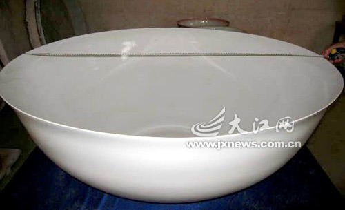由景德鎮(zhèn)精心燒制完成的一只白薄胎大瓷碗和一塊大白瓷板近日面世。大瓷碗直徑1.23米、高1.58米、厚度為1.7毫米,形如一只大浴盆;白瓷板長3.68米、寬1.58米,也碩大無比。經(jīng)有關(guān)專家和景德鎮(zhèn)陶瓷協(xié)會鑒定,兩件作品系景德鎮(zhèn)陶瓷燒造有史以來同類品種中單體尺寸最大、拉坯制作工藝最難的作品,堪稱“碗王”、“板王”。據(jù)悉,兩件作品正在申報吉尼斯世界紀錄。