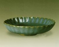 此盤花口,淺腹,腹壁有三十一條出筋組成,平底,圈足支燒,足內(nèi)無釉,通體有開片,是宋、元時期北方常見尚好的一種器型,胎骨略厚重、堅硬,呈灰白色。天青色釉,色澤光潤,盤心和盤壁一側(cè)均有一塊云狀玫瑰紫窰變釉,釉上有氣泡,斑塊顏色是銅、鐵還原的結(jié)果,是兩液分相的工藝特色,這件天青釉花口盤是元代鈞窯承襲宋代鈞窯工藝而燒制較好的一件作。