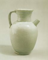 高頸,喇叭口,口沿外侈,卵形眉腹,餅狀底,肩部前置管狀短流,后置雙圓條鋬手,與口沿相聯(lián)系,造型典雅、簡潔。器體內(nèi)外滿施白釉,底部露胎,釉色勻潤,白中閃青,胎骨細(xì)膩堅(jiān)致,為河北邢窯晚唐時期的優(yōu)質(zhì)產(chǎn)品。