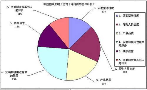 而具體到是哪些因素影響了對于經(jīng)銷商的總體評價,24%的網(wǎng)友表示是安裝和使用過程中的服務(wù)影響了他們對于經(jīng)銷商的評價,產(chǎn)品品質(zhì)作為一個重要因素占到了20%的比例,而作為與顧客的直接接觸者,導(dǎo)購人員的態(tài)度占了19%,此外,商家信譽(yù)和店面整潔度各自占有13%的比重,而親戚朋友或者其他人的評價占到11%的比重,口碑傳播是陶瓷衛(wèi)浴產(chǎn)品選購的一個重要決定因素。
