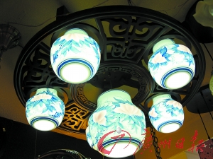 大南路的泰古燈飾城,是廣州較早的燈飾市場,價格也比較平民化。在二樓,記者看到一種非常漂亮的瓷藝燈,它采用一種薄胎瓷代替玻璃制成燈罩,在燈罩上面繪上山水、花草、人物等圖案,再配上精致的木制燈座,將古樸的瓷器巧妙地融入現(xiàn)代生活中。