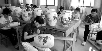 珠山八友傳人王錫良大師正在指導(dǎo)曹利英畫瓷