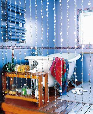 圖解:二:半開(kāi)放式風(fēng)情浴室 巧妙利用百葉、珠簾等軟隔斷將空間進(jìn)行一次分隔,開(kāi)“開(kāi)放”的基調(diào)上制造“私密”,給自己一個(gè)靈活的選擇。 1、格局要素:衛(wèi)浴間矮墻隔斷巧妙分隔空間。 2、材質(zhì)要素:亮片珠簾為衛(wèi)浴間營(yíng)造嫵媚浪漫。 3、器物要素:衛(wèi)浴間外的洗手池使用很方便。