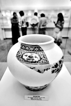 觀眾在欣賞復(fù)原的毛家灣瓷器。昨日,近300件毛家灣瓷器坑出土的瓷片在北京藝術(shù)博物館展出。