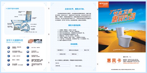 安華廠家與經(jīng)銷商聯(lián)手,積極響應(yīng)國家號(hào)召,在行業(yè)內(nèi)率先效仿“家電下鄉(xiāng)”,于7月18日到8月18日舉行為期一個(gè)月的衛(wèi)浴文化節(jié)。此次活動(dòng)的主題為:節(jié)水衛(wèi)浴,惠民行動(dòng)。“惠民”意在把更多的實(shí)惠帶給消費(fèi)者。活動(dòng)期間,安華衛(wèi)浴全國各大店所有單品、套餐抄底特惠,最令人驚喜的是:現(xiàn)場正在出售一種叫“惠民卡”的小卡片,在卡上可以看到:優(yōu)惠面涉及到座便器、浴缸、淋浴房、浴室柜單品以及經(jīng)典套餐,各式各樣,應(yīng)有盡有,優(yōu)惠幅度從100元到800元不等。