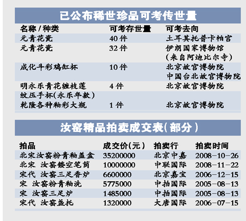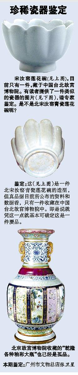 瓷器中有個別品種已被學(xué)術(shù)界確認(rèn)為孤品,以北宋汝窯青瓷蓮花碗為例,據(jù)可查資料,目前僅有一件存于中國臺北故宮博物院中。在市場上流通的汝窯瓷器并不多,而且均以天價成交。如在2008年以3520萬元成交的北宋汝窯粉青釉蓋盒、2008年拍出1000萬元的北宋汝窯鏤空筆筒。其他汝窯瓷器動輒以數(shù)百萬元價格成交。連清乾隆、雍正時期仿制的汝窯瓷器也可拍出100萬元以上價格。