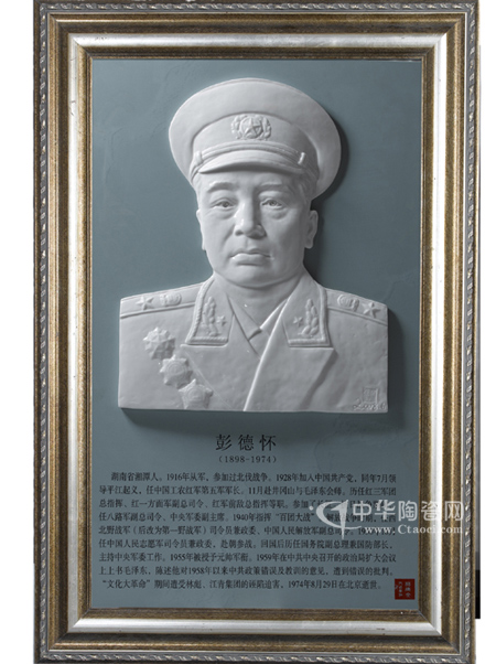 瓷藝大師林建全通過(guò)建白瓷獨(dú)特創(chuàng)造出彭德懷人物浮雕壁飾,藝術(shù)再現(xiàn)了彭德懷老一輩革命家的風(fēng)采。此浮雕壁飾的厚度只有2-3mm,人物雕塑栩栩如生,技術(shù)難度相當(dāng)高,林建全也是耗費(fèi)巨資歷經(jīng)十幾年的不斷探索才研制成功,具有極高的欣賞、收藏價(jià)值。而且林建全還創(chuàng)造性地將彭德懷元帥的簡(jiǎn)歷,用陶瓷花紙經(jīng)過(guò)低溫?zé)聘街谧髌分,從而使作品充滿濃厚的文化氣息,具有啟迪智慧、警示人生的作用。
