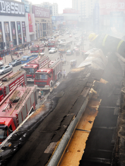 據(jù)現(xiàn)場救援的消防官兵介紹,起火點位于陶瓷商場二樓西側(cè),由于牌匾、房蓋、臨街外墻裝飾材料都是易燃物質(zhì),給撲救帶來很大困難。明火被撲滅后,這些易燃物還在冒煙并有死灰復(fù)燃的危險,消防官兵只能不停地打水、破拆排除火患。