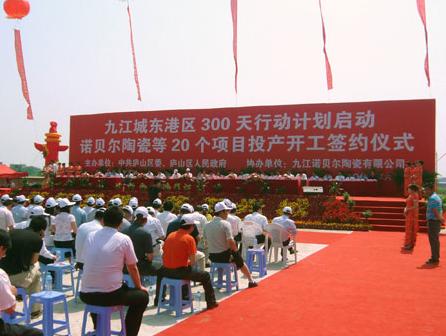 2009年6月5日,江西省九江城東工業(yè)新城一個(gè)個(gè)重頭項(xiàng)目相繼亮相:總投資5.6億元的東海造船項(xiàng)目首艘7000噸油輪即將下水、投資1.2億元的科茵格瀝青項(xiàng)目正式投入生產(chǎn)、投資1.8億元的嘉盛糧油項(xiàng)目破土動(dòng)工建設(shè),而特別引人注目的是,投資15億元的諾貝爾陶瓷項(xiàng)目宣布投產(chǎn)。諾貝爾這個(gè)從1992年開始在杭州立足的中外合資陶瓷品牌,以其規(guī);纳a(chǎn)和市場(chǎng)化的運(yùn)作,樹起陶瓷品牌的標(biāo)桿。