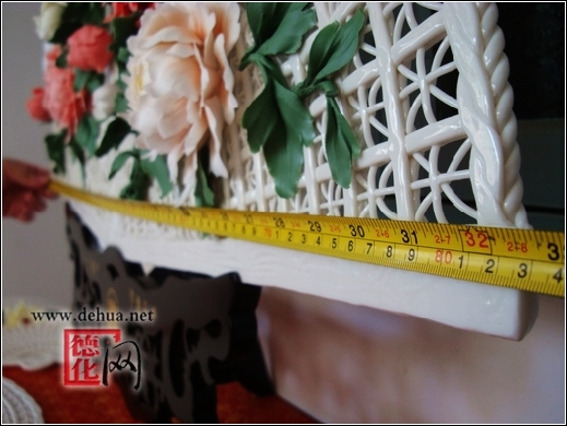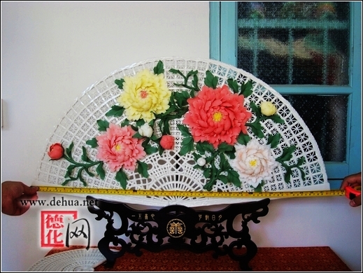 “景德鎮(zhèn)也有瓷扇,但它只有三十幾公分,但目前為止,像這樣胚面薄、展開扇形80多公分寬的瓷扇還僅我一家”,我們現(xiàn)場拿了鋼尺對牡丹瓷扇進(jìn)行測量。