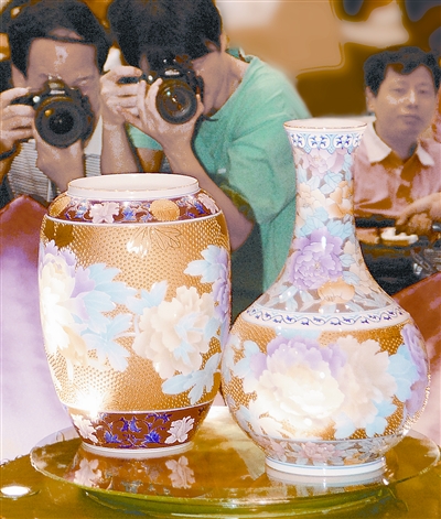 “盛世中華和合對(duì)瓶”展臺(tái)被啟動(dòng),對(duì)瓶從直徑2米長(zhǎng)的蓮花臺(tái)中徐徐升起,完全展現(xiàn)出來(lái)。作為向新中國(guó)60華誕獻(xiàn)禮的珍品,其驚艷亮相博得滿堂喝彩!今天下午,由省文化廳、株洲市人民政府與醴陵元詔瓷業(yè)有限公司在長(zhǎng)沙聯(lián)合舉辦了“中國(guó)湖南·國(guó)禮瓷進(jìn)京獻(xiàn)禮新中國(guó)60華誕暨限量絕版發(fā)行信息發(fā)布會(huì)”。